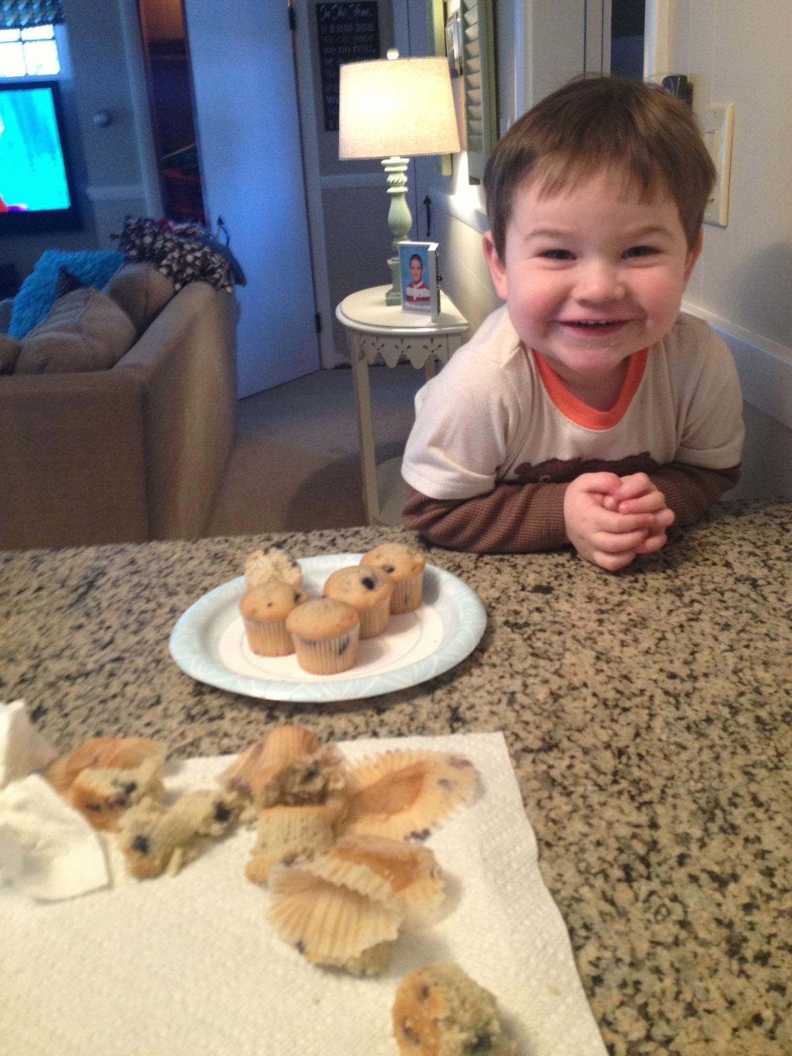In her absence, evidently assaulted by severe hunger pangs, you had decided to open the box of mini muffins still on the counter from breakfast. You took a plate and then went about surgically removing the wrappers to “at least eight muffins” as later reported by your Mom, the only witness to the deed.