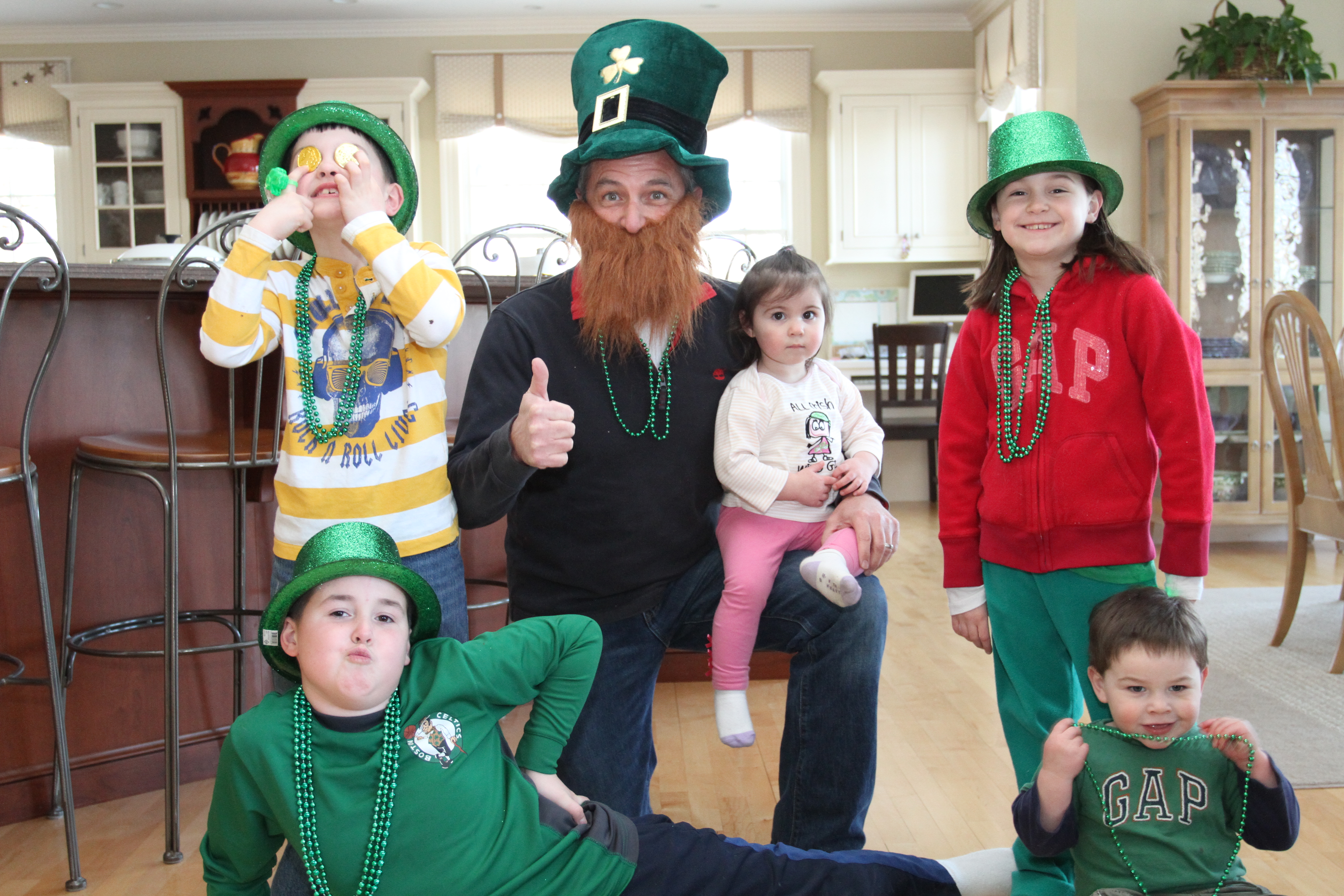 it was crazy times at 44 Waterloo today! Grammy and I bought all of you green beads, sparkly green hats and light-up leprechaun rings. We had green cupcakes and Grammy even made her famous dip green! The centerpiece on the kitchen table was a pot-o-gold filled with “leprechaun coins” – you guys loved playing with the gold. Molly and Ainsley joined in too, but as usual, they were too busy playing together to pose for a picture!