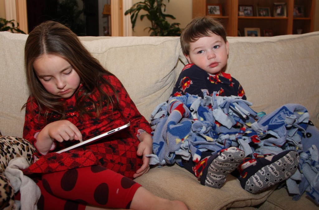 IN TROUBLE - You weren't very pleased with me as I took this photo because I took your binky out of your mouth! It was right before you & your family left our house on a Sunday night... 7:30 pm and way past your bedtime. You let me snap the shot, but you were NOT happy the whole time, as you can plainly see. You are surrounded by your special sleepy blanket which you can't live without when the going gets tough. Molly, on the other hand, doesn't seem very tired does she? Your sister's always raring to go!
